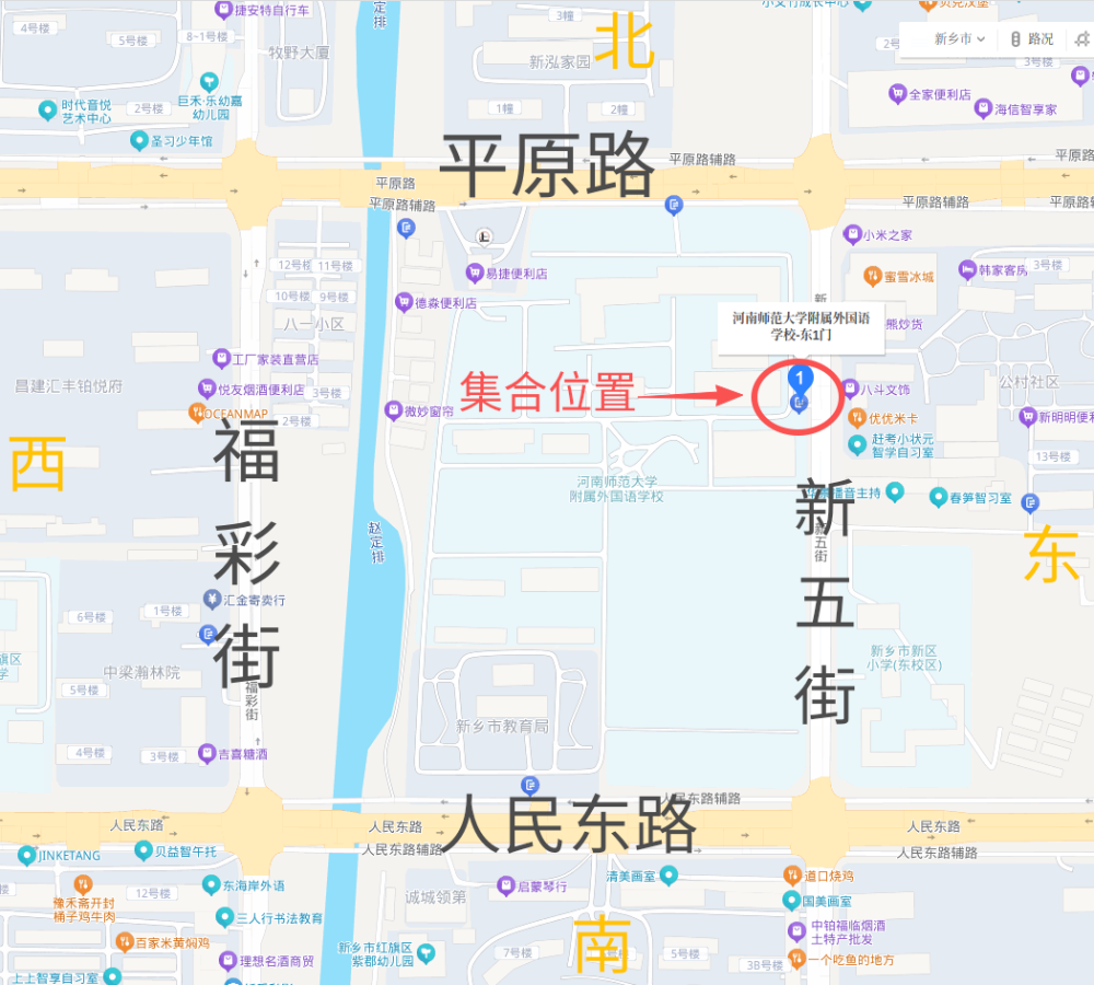面试地点:河南师范大学附属外国语学校(原新乡市第一中学东校区初中部),集合位置:新乡市红旗区新五街与平原路交叉口南240米,位置见附件6。